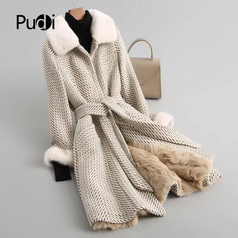 A68247 Women Herringbone wool belt coat mink fur collar lamb fur lining jacket overcoat winter warm coat genuine winter coat