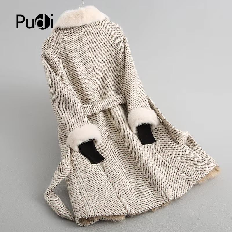 A68247 Women Herringbone wool belt coat mink fur collar lamb fur lining jacket overcoat winter warm coat genuine winter coat