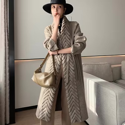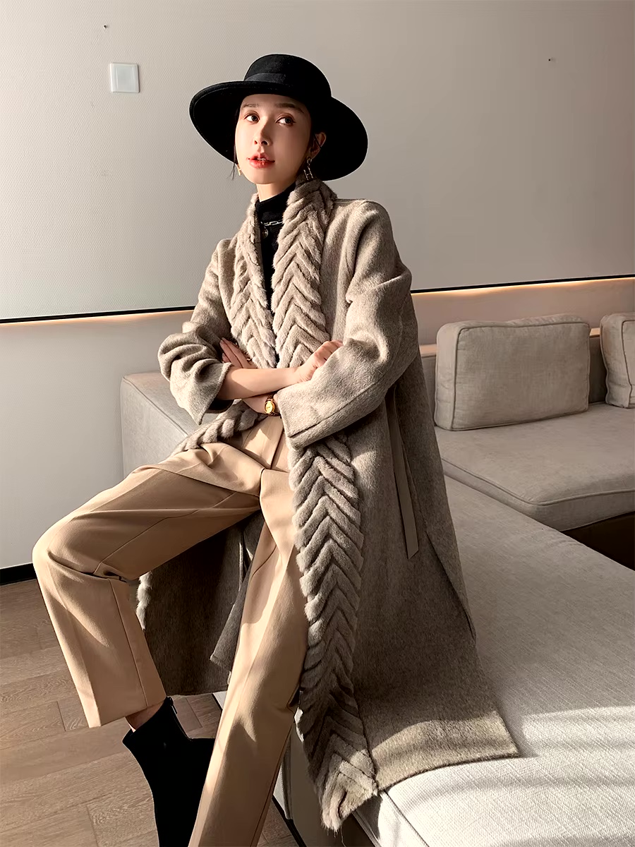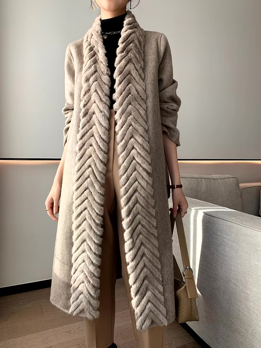 Luxury Real Mink Fur Collar Double Face Wool Coat For Women New Winter Lady Elegant Warm Cashmere Long Cardigan With Belt