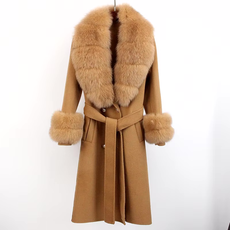 Women Winter Trend Real Fox Fur Collar Jacket Wool Cashmere Coat Real Fur Warm Overcoat Fashion Lady Big Fur Coat