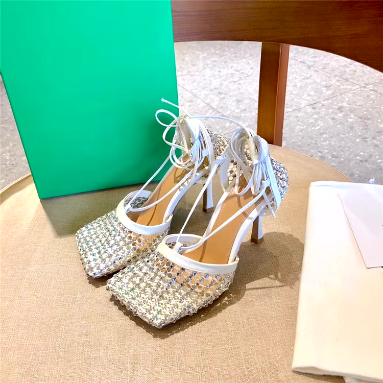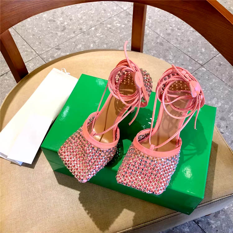 Luxury Rhinestones Square Toe High Heels Mesh Hollow Out Lace Up Sandals For Women
